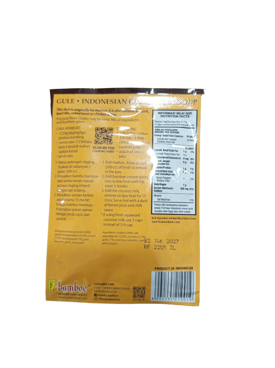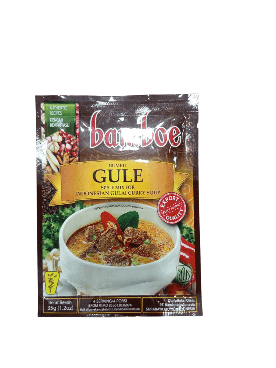 Hadirkan cita rasa khas Nusantara dalam hidangan Anda dengan BAMBOE Gule 35gr. Bumbu instan ini diracik dari rempah-rempah pilihan berkualitas tinggi untuk menghasilkan rasa autentik masakan gule khas Indonesia. Cocok untuk memasak berbagai jenis daging seperti kambing, sapi, atau ayam dengan kuah santan yang gurih dan harum.