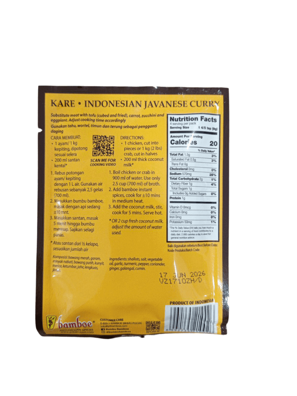 Masak kare khas Nusantara jadi makin praktis dengan BAMBOE Kare 36gr. Terbuat dari campuran rempah-rempah tradisional berkualitas, bumbu ini menghadirkan rasa kare yang gurih, kaya rempah, dan harum menggoda – seperti masakan rumahan buatan ibu.