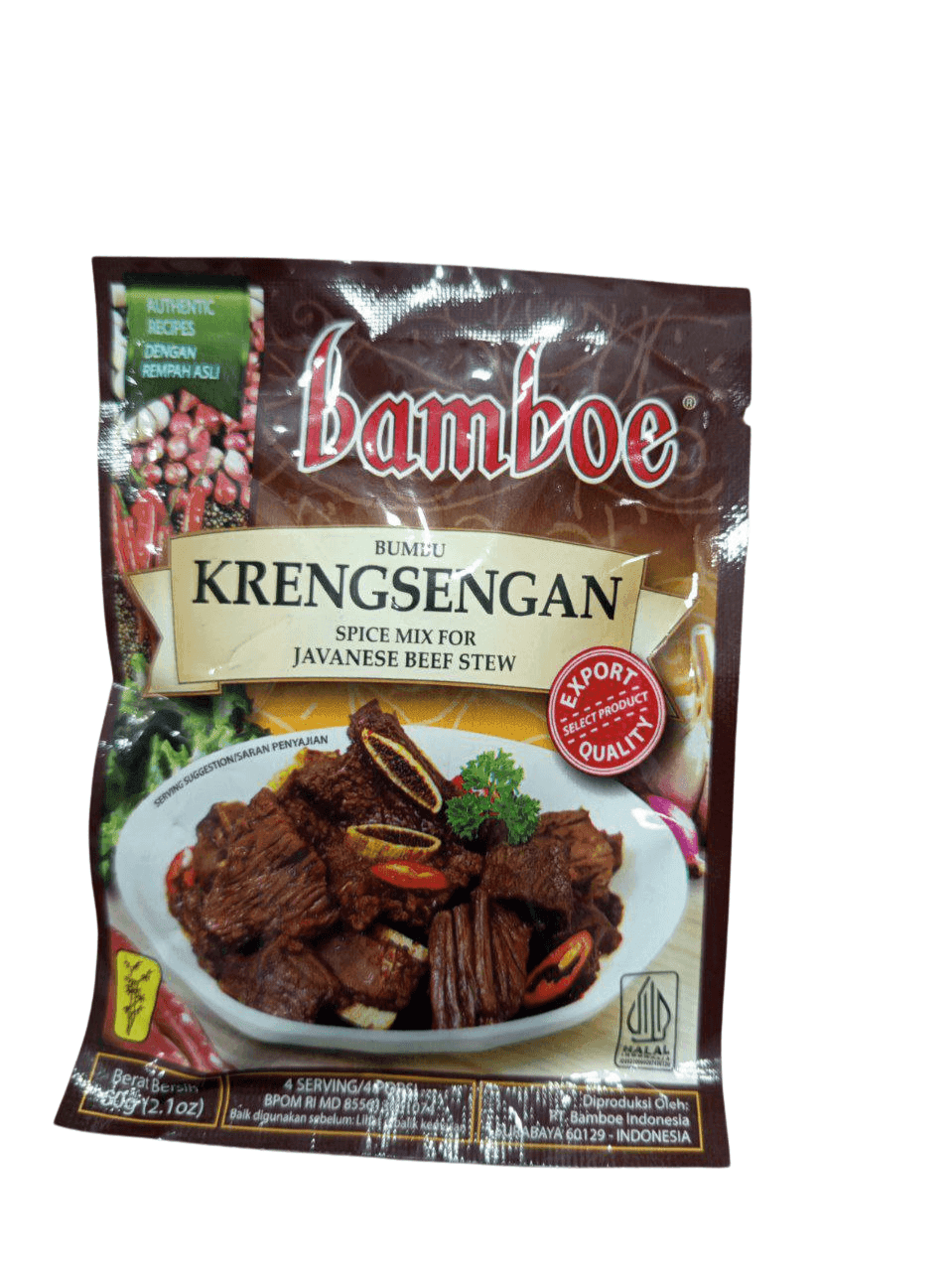 Hadirkan cita rasa khas Jawa Timur langsung di dapur Anda dengan BAMBOE Kresengan 60gr. Bumbu praktis ini diformulasikan khusus untuk memasak olahan daging sapi, ayam, atau kambing dengan rasa manis gurih dan aroma rempah yang kuat khas masakan tradisional Kresengan. Terbuat dari bahan-bahan pilihan dan tanpa pengawet, BAMBOE Kresengan siap memudahkan Anda menyajikan masakan rumahan yang autentik dan lezat.
