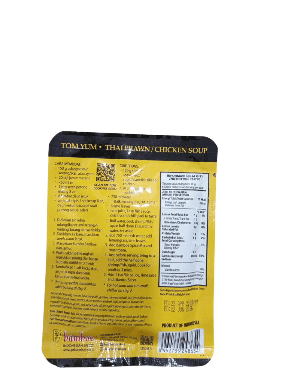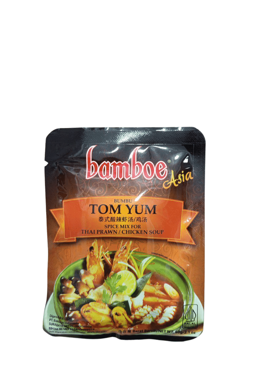 Nikmati kelezatan Tom Yum, sup khas Thailand yang asam, pedas, dan harum rempah, dalam waktu singkat dengan BAMBOE Tom Yum 60gr. Diracik dari bumbu pilihan dan rempah autentik, cocok untuk sajian seafood, ayam, atau jamur dengan cita rasa internasional.