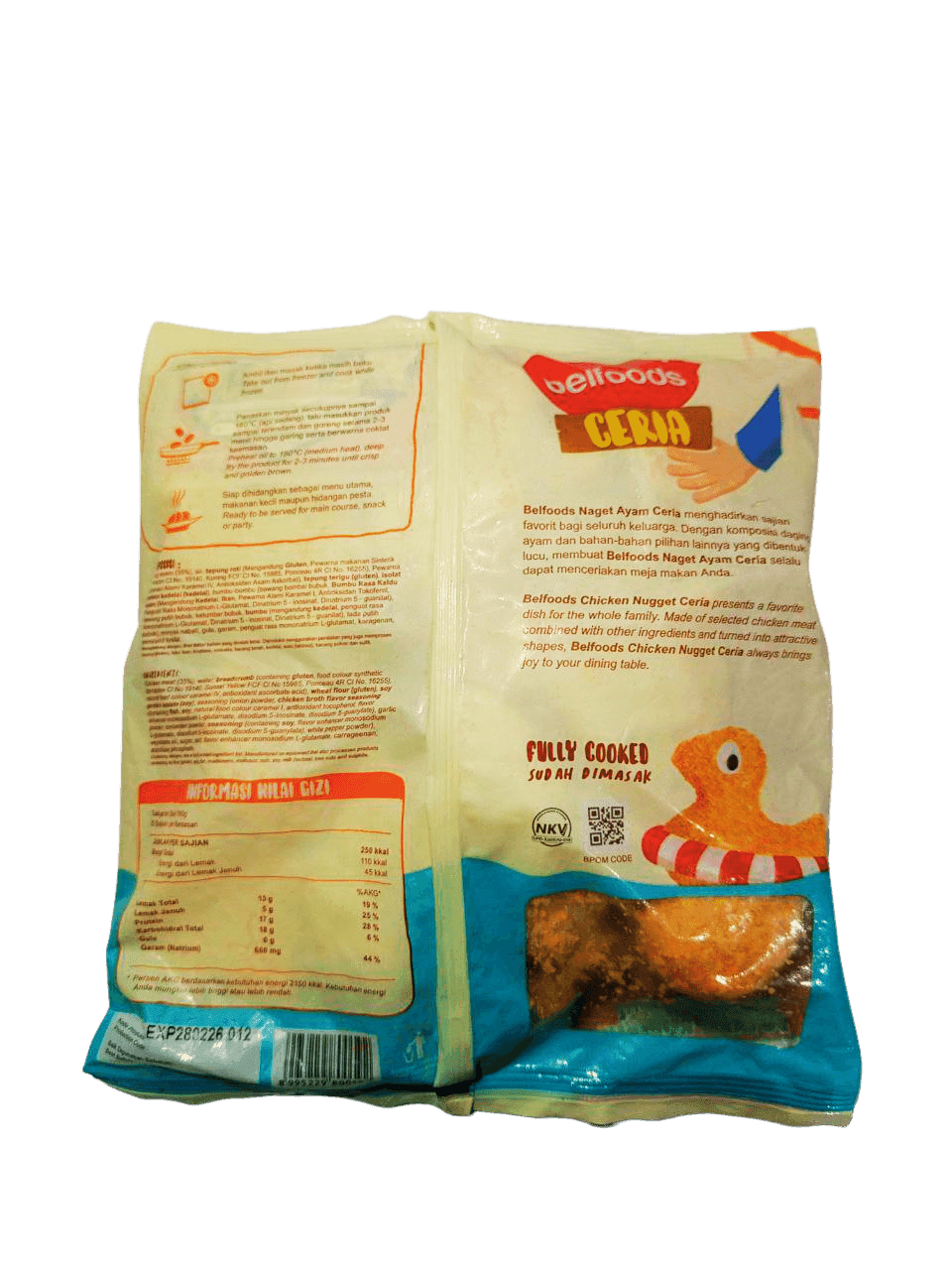 BELFOODS Nugget Ceria adalah nugget ayam siap goreng dengan beragam bentuk lucu dan menarik yang dirancang khusus untuk anak-anak. Dibuat dari daging ayam pilihan dan bumbu berkualitas, nugget ini memiliki rasa gurih dan tekstur renyah setelah digoreng. Cocok untuk bekal, camilan, atau lauk harian yang bikin makan jadi lebih seru!