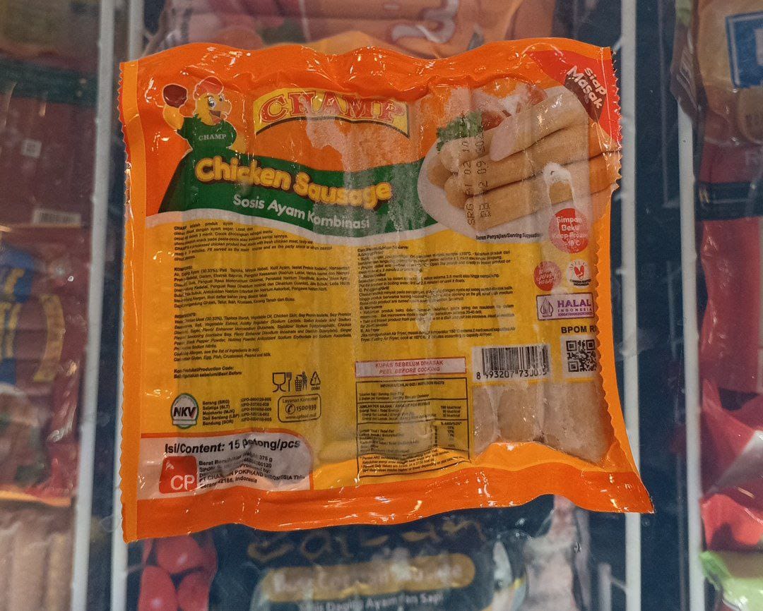 CHAMP Chicken Sausage 375GR adalah sosis ayam beku berkualitas premium yang diproduksi oleh PT Charoen Pokphand Indonesia (CP Group), produsen terpercaya di bidang frozen food. Sosis ini terbuat dari daging ayam pilihan yang diolah dengan bumbu khas, memberikan aroma asap yang ringan dan rasa gurih yang lezat.