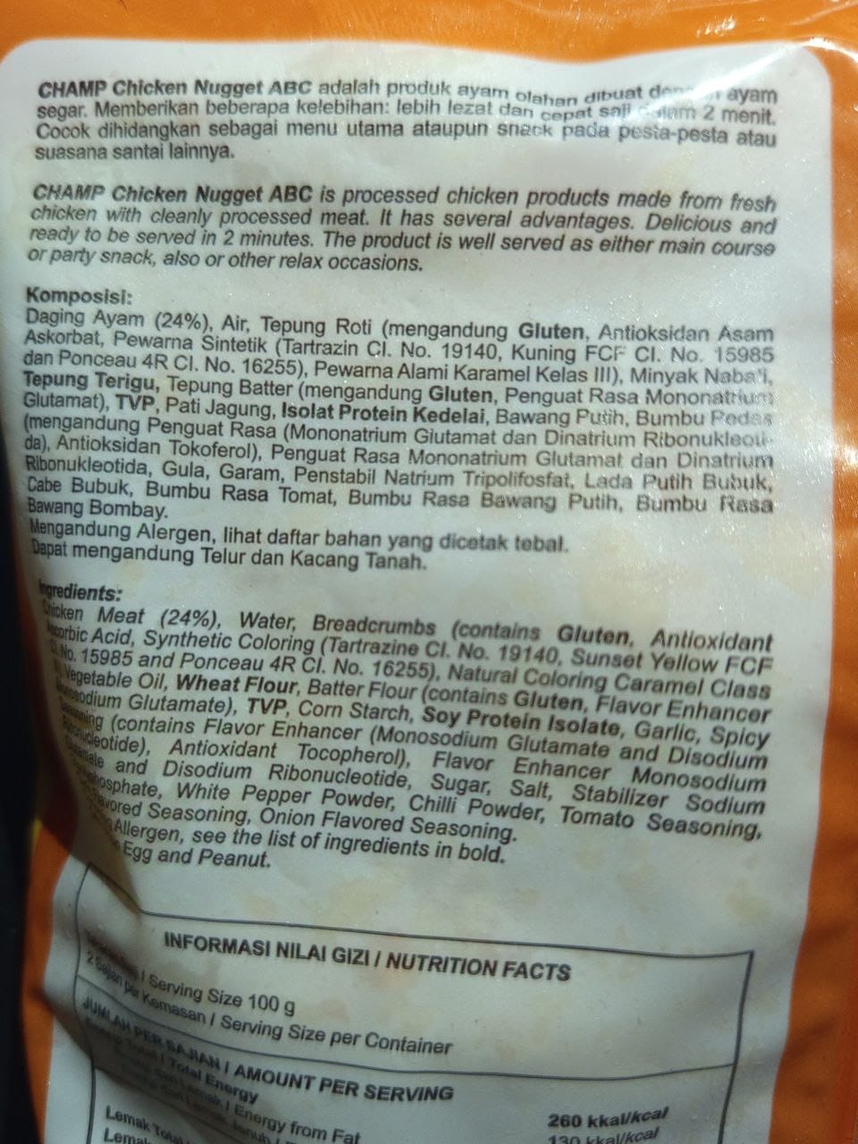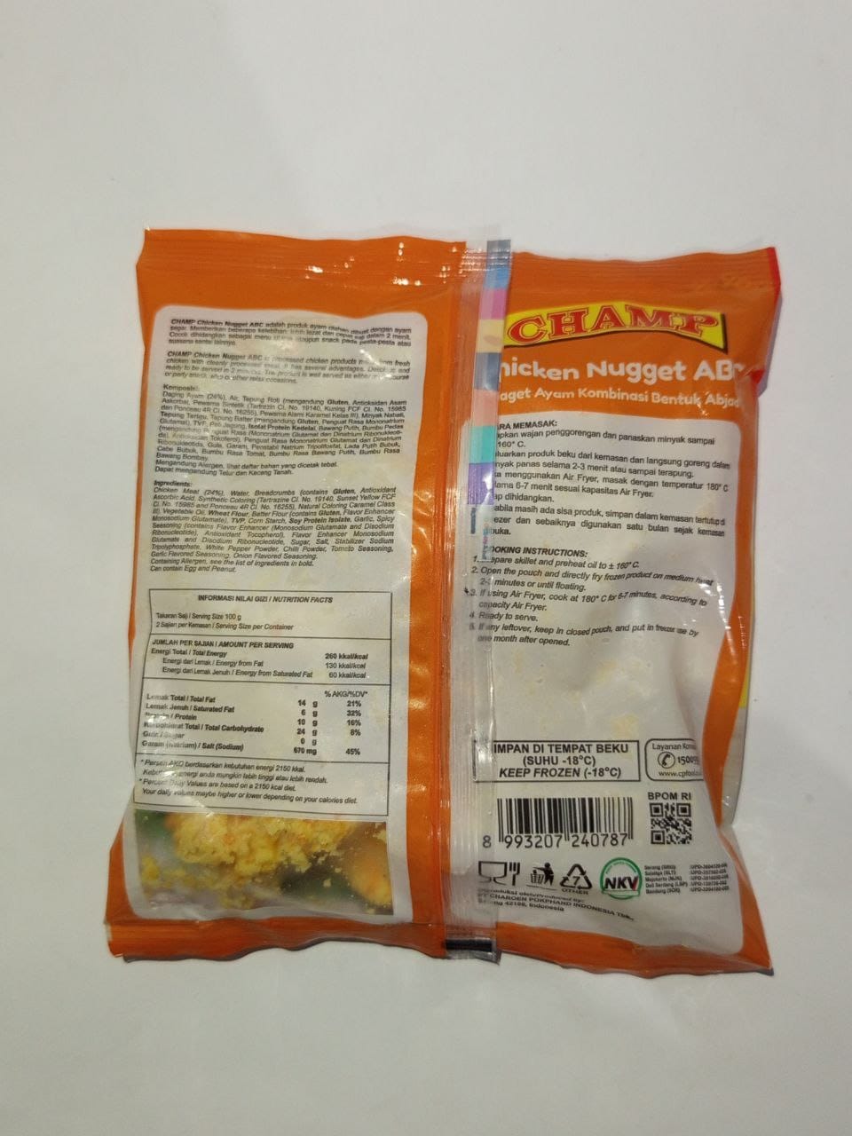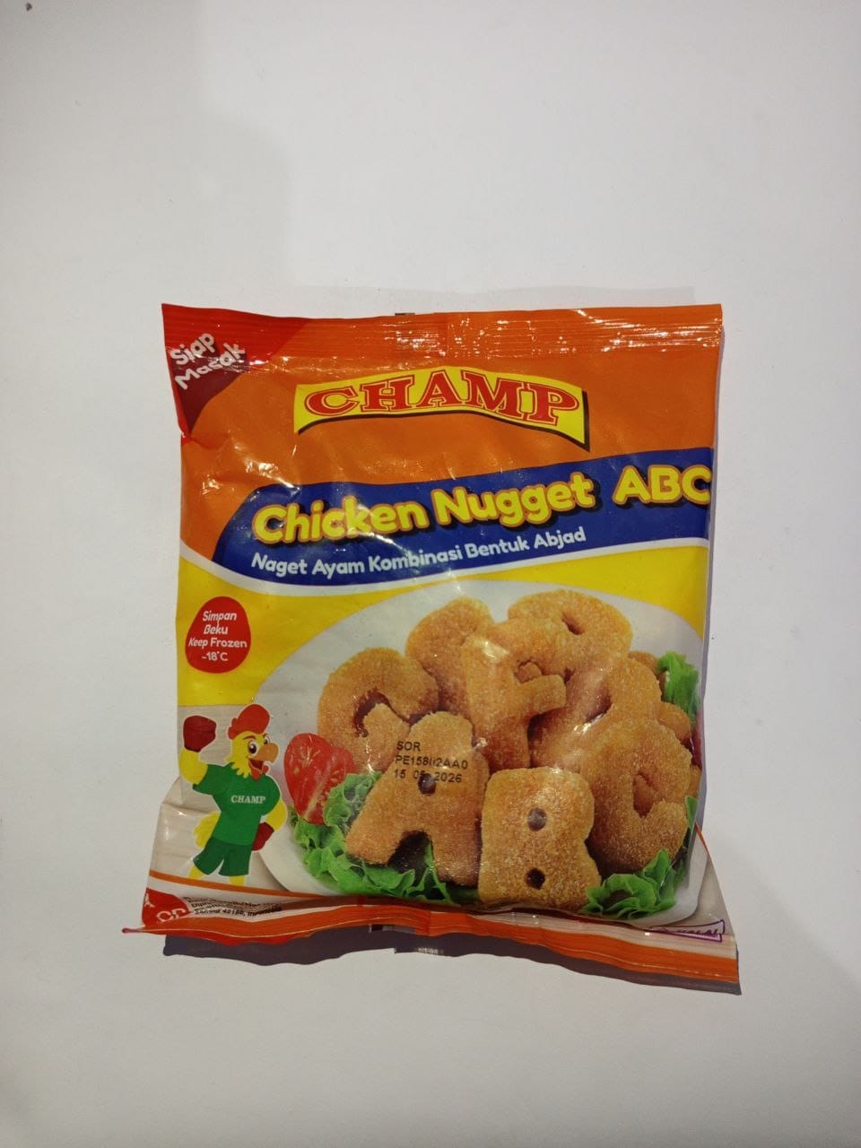 CHAMP Nugget ABC adalah nugget ayam dengan bentuk huruf A–Z yang seru, edukatif, dan tentu saja lezat! Terbuat dari daging ayam pilihan, dibumbui dengan cita rasa khas CHAMP, dan dilapisi tepung renyah yang menggoda selera saat digoreng.