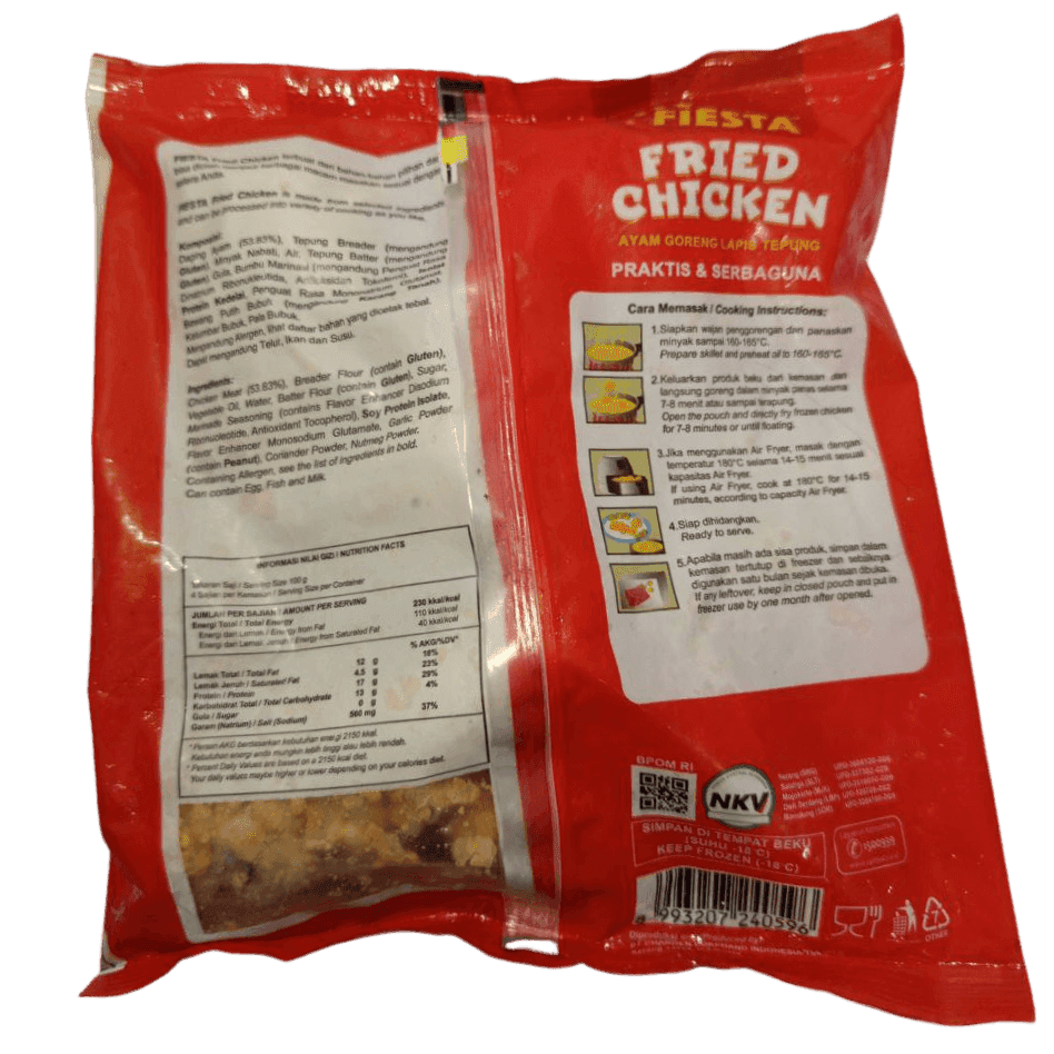 Nikmati kelezatan ayam goreng renyah ala restoran di rumah Anda dengan FIESTA Fried Chicken 400gr. Terbuat dari potongan ayam pilihan yang dibumbui secara merata dan dilapisi tepung khas Fiesta, memberikan tekstur yang renyah di luar dan juicy di dalam.