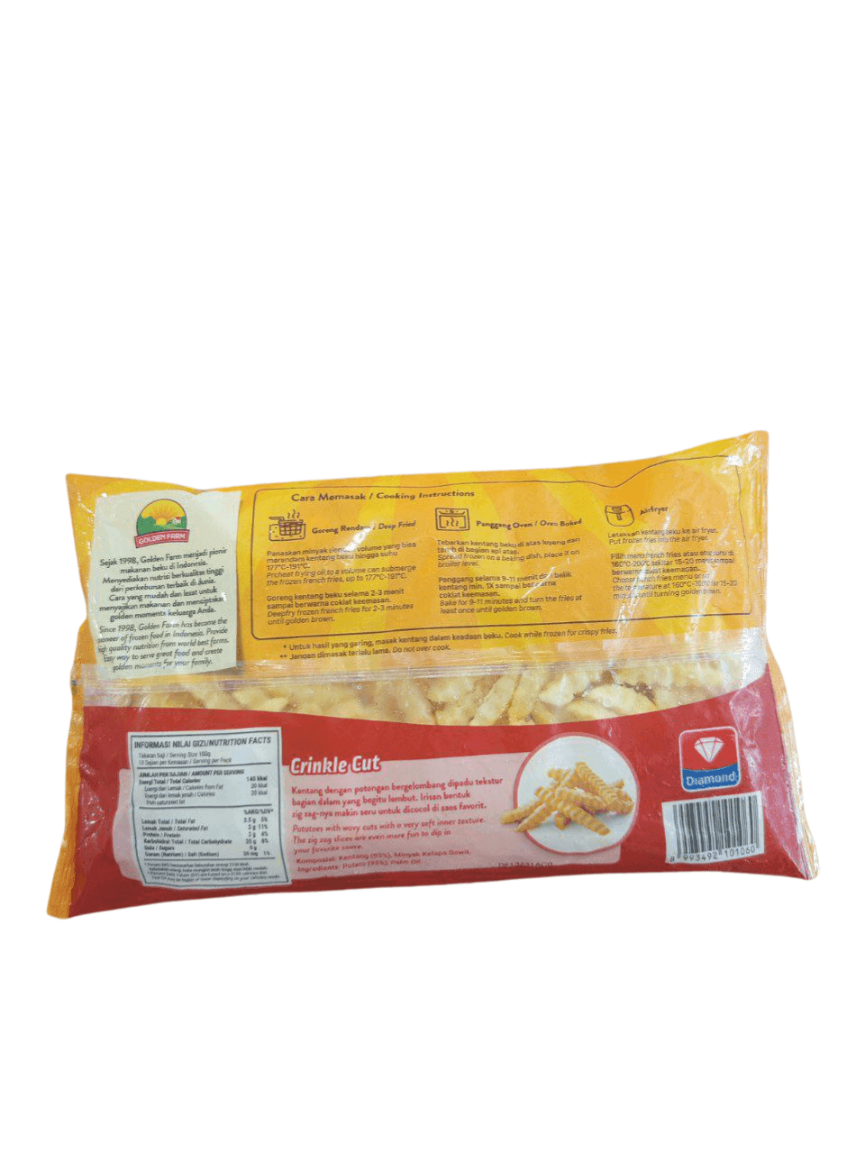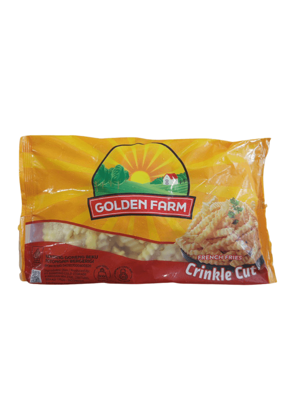 Kentang goreng beku berkualitas dari Goldenfarm, dipotong dengan model crinkle cut bergelombang yang renyah di luar dan lembut di dalam. Terbuat dari kentang pilihan dan diolah dengan teknologi beku cepat (IQF) untuk menjaga kesegaran dan rasa alami.