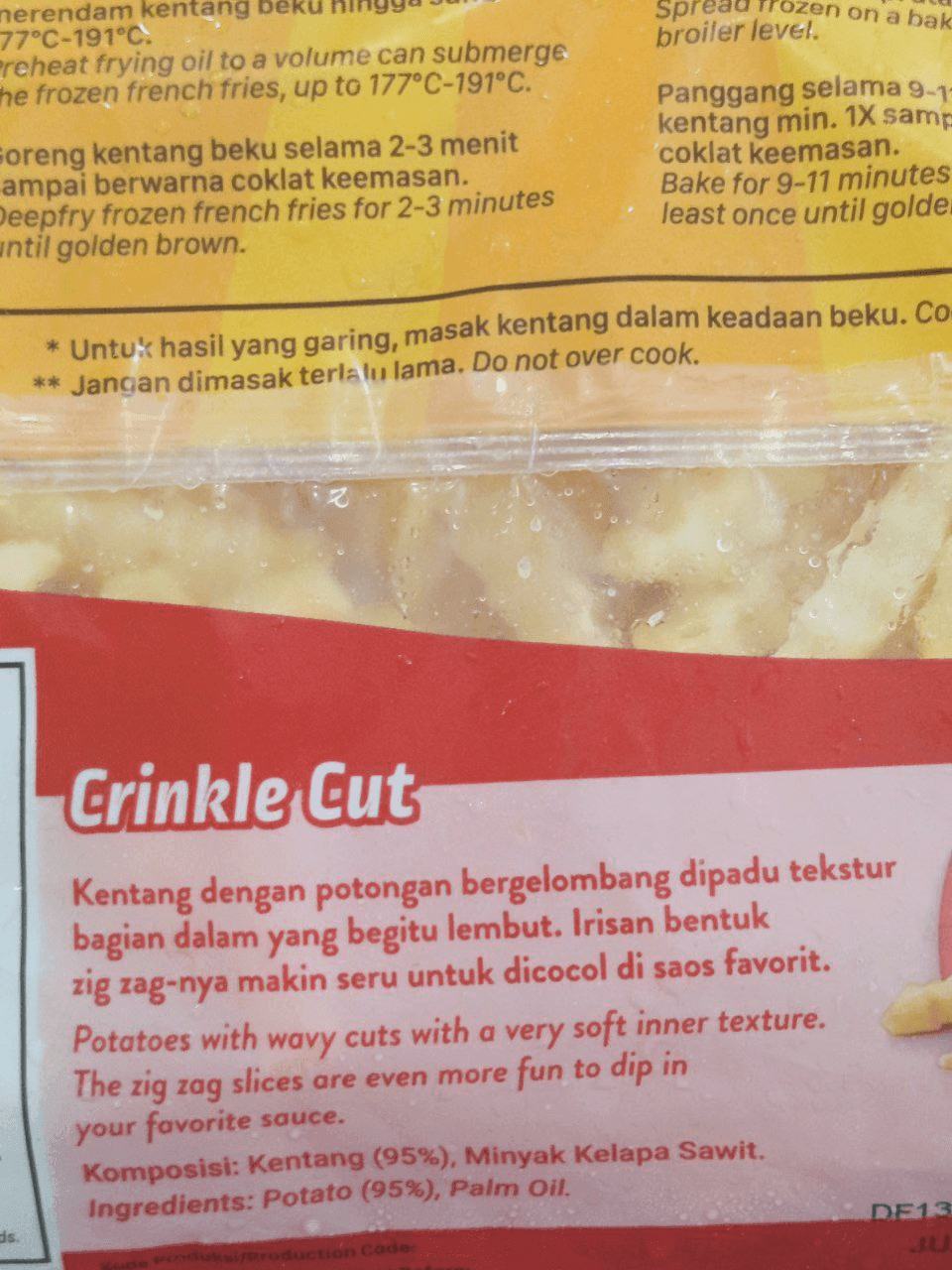 Dengan potongan bergelombang yang khas, GOLDENFARM Crinkle Cut cocok disajikan sebagai camilan, pelengkap hidangan, atau menu andalan usaha kuliner Anda. Mudah disimpan dan cepat disajikan—cukup digoreng dalam minyak panas hingga keemasan, siap memanjakan lidah!