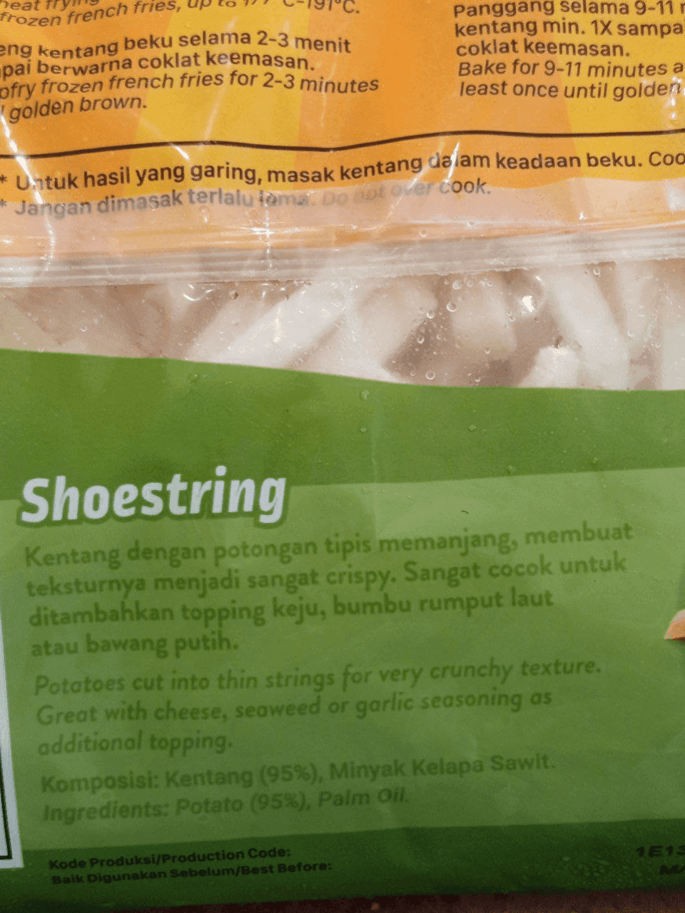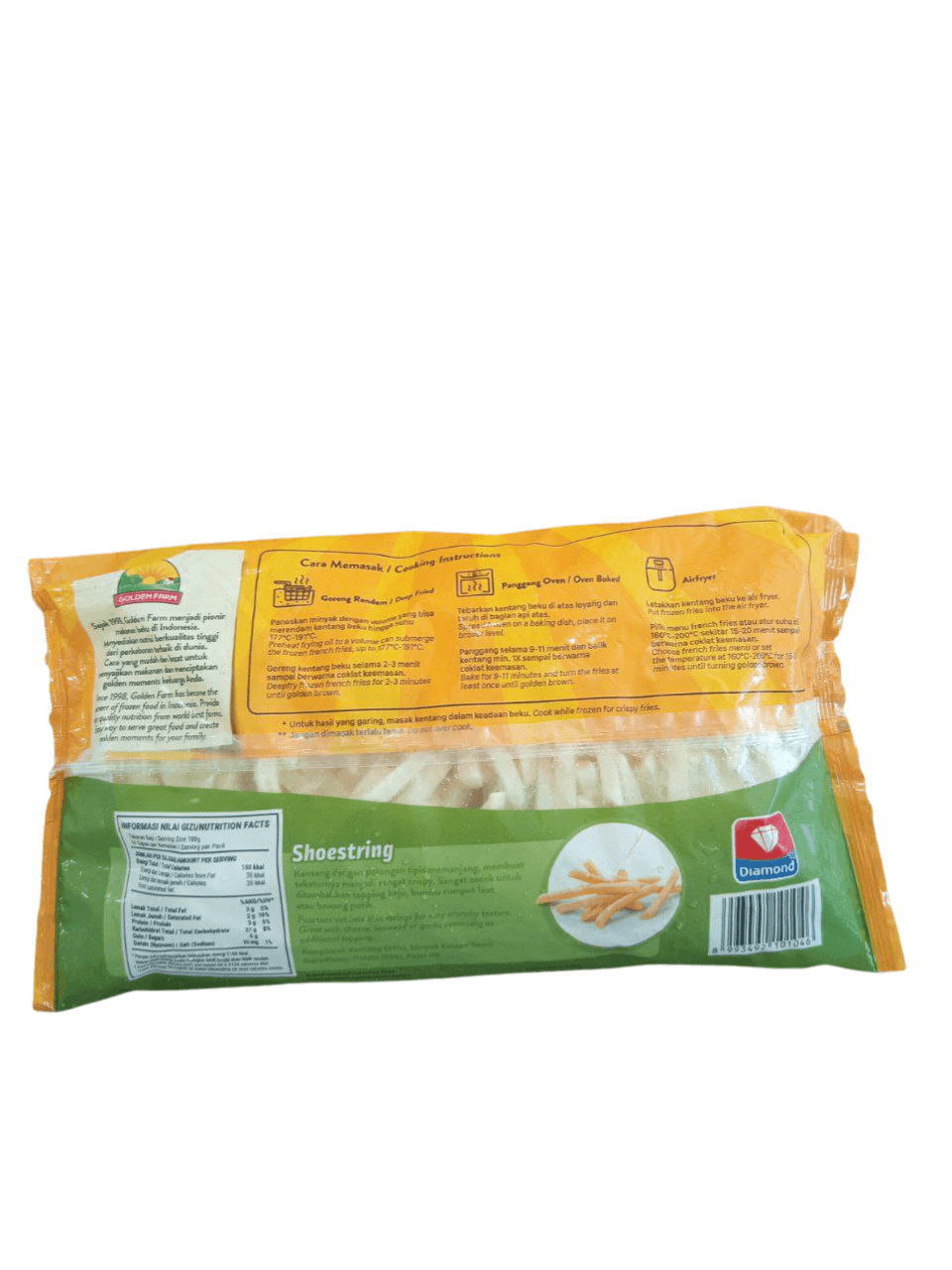 Nikmati kerenyahan sempurna dengan GOLDENFARM FF Shoestring 1kg, kentang goreng beku berkualitas premium yang praktis dan lezat! Potongan tipis (shoestring cut) menjadikan kentang ini cepat matang dan renyah saat digoreng. Cocok disajikan sebagai camilan, pelengkap burger, steak, atau menu andalan usaha kuliner Anda.