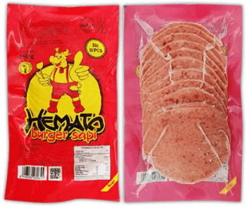Hemato Beef Burger atau Daging Burger Sapi Hemato adalah produk olahan daging sapi berbentuk pipih dan bulat (patties) yang digunakan sebagai isian utama roti burger.