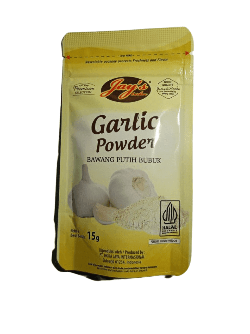 Dengan kemasan kecil 15 gram, JAY’S Garlic Powder cocok untuk kebutuhan dapur rumah tangga maupun usaha kuliner skala kecil. Rasanya yang kuat dan autentik membuat setiap masakan jadi lebih lezat dan menggugah selera.