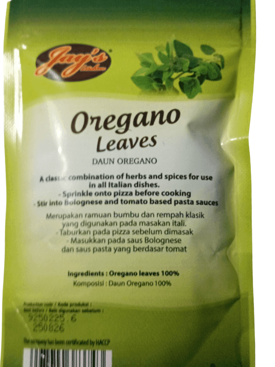 Dengan kemasan praktis 6 gram, JAY’S Oregano Leaves sangat cocok untuk digunakan di dapur rumah maupun usaha kuliner. Bebas bahan pengawet dan pewarna, menjaga cita rasa tetap murni dan alami.
