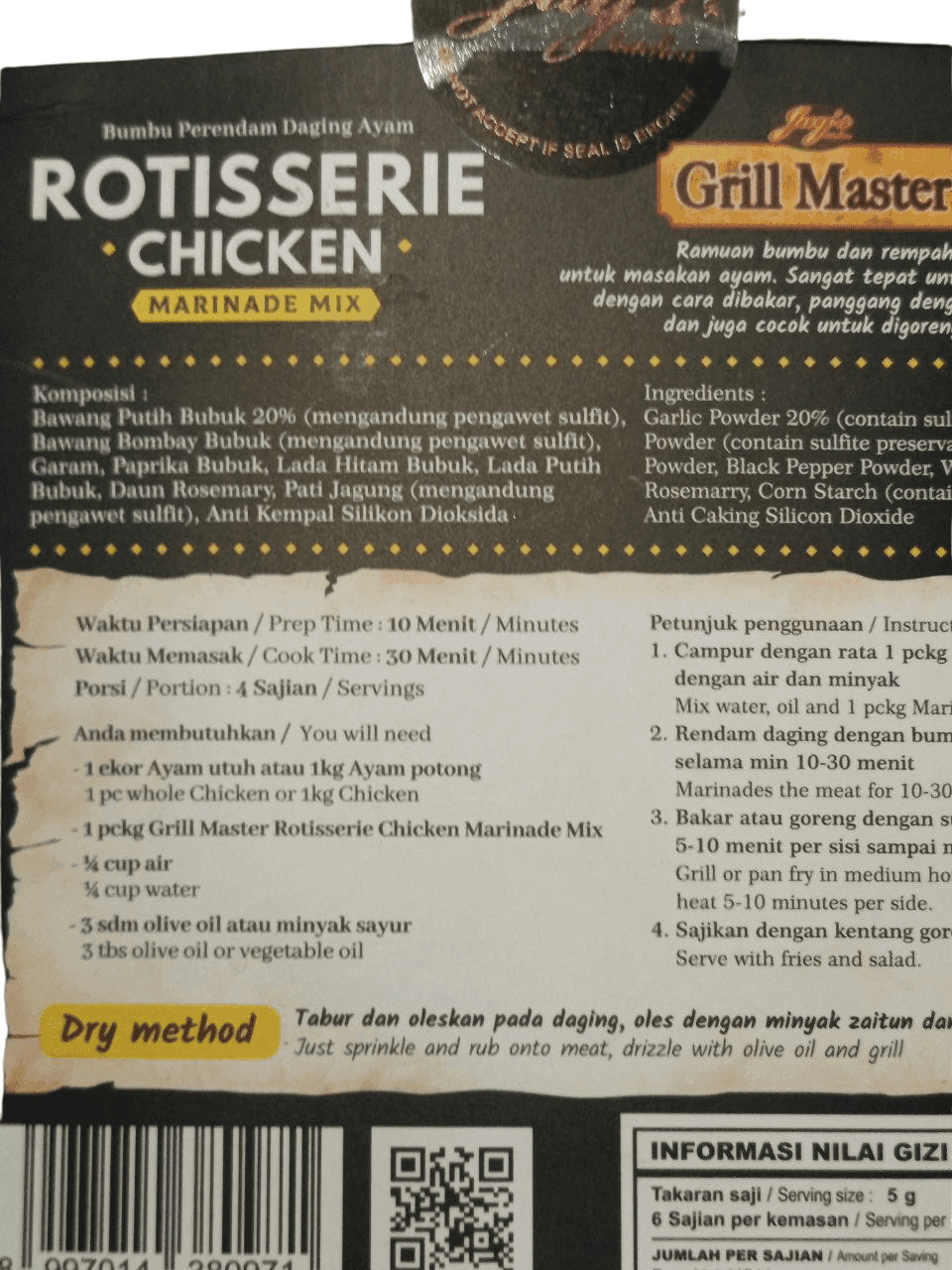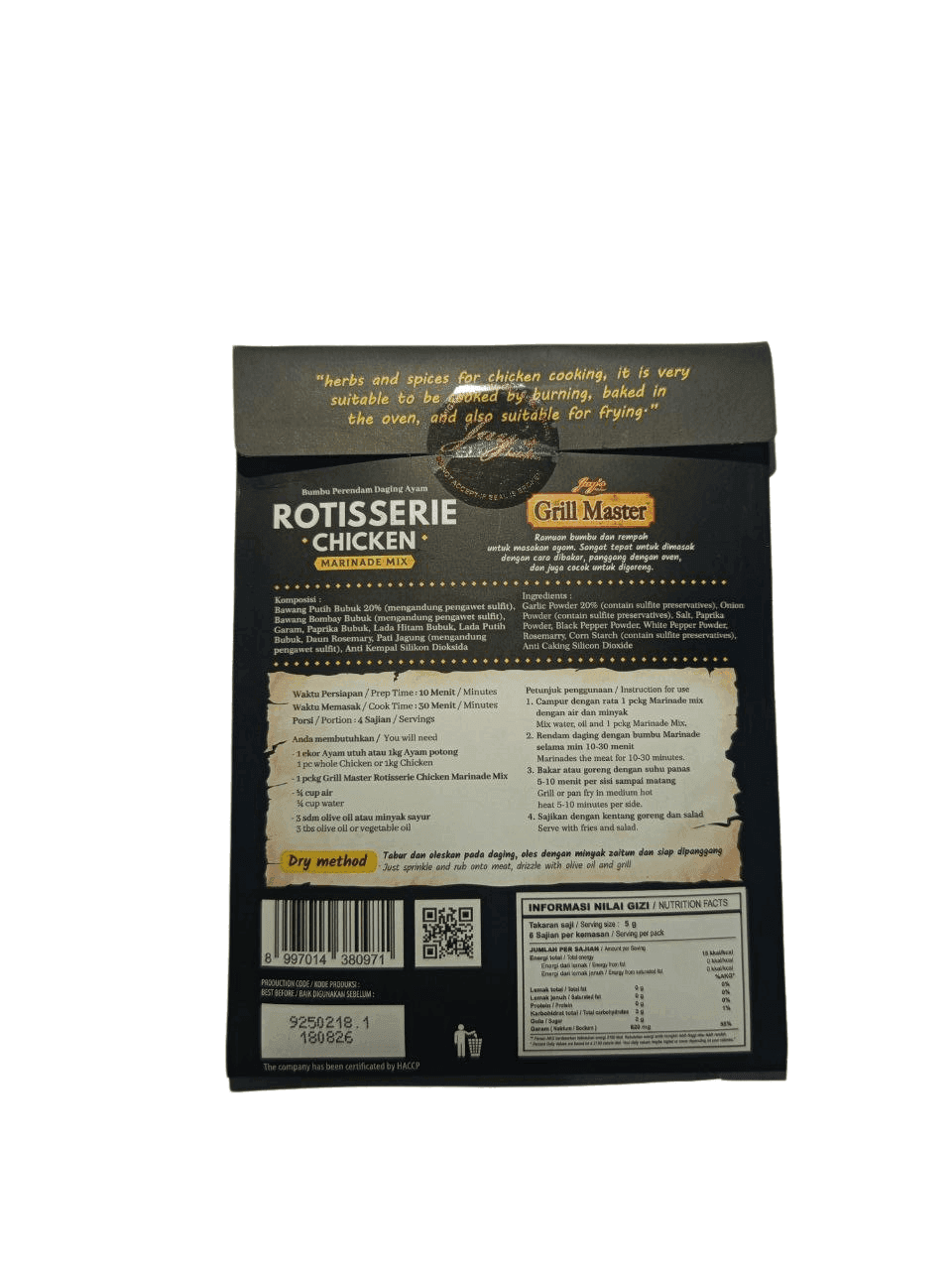 Dibuat dari bahan pilihan dan racikan bumbu yang seimbang, aroma panggangan khas rotisserie langsung terasa sejak pertama kali ditaburkan. Nikmati sensasi rasa ayam panggang ala restoran dalam setiap gigitan!