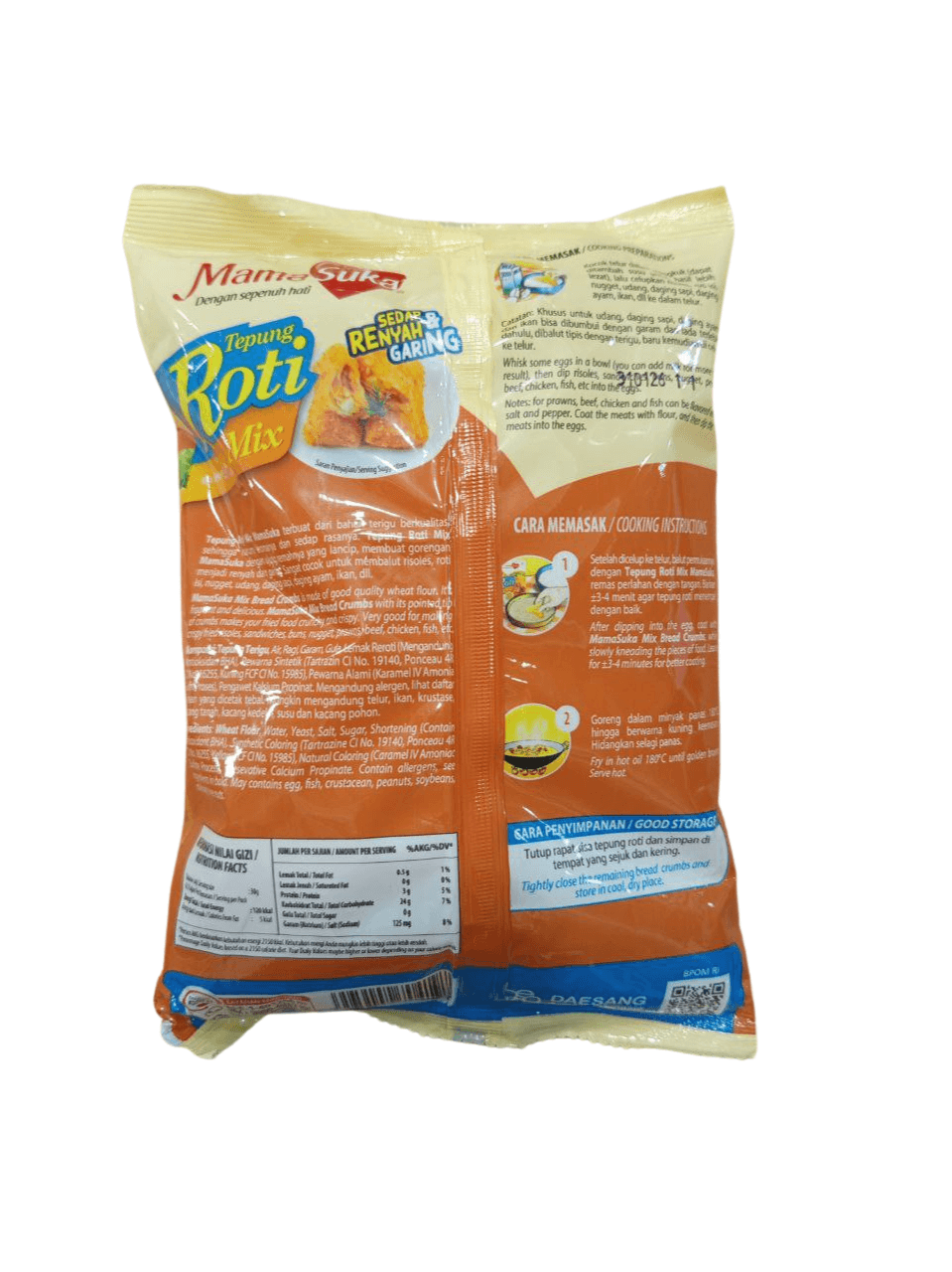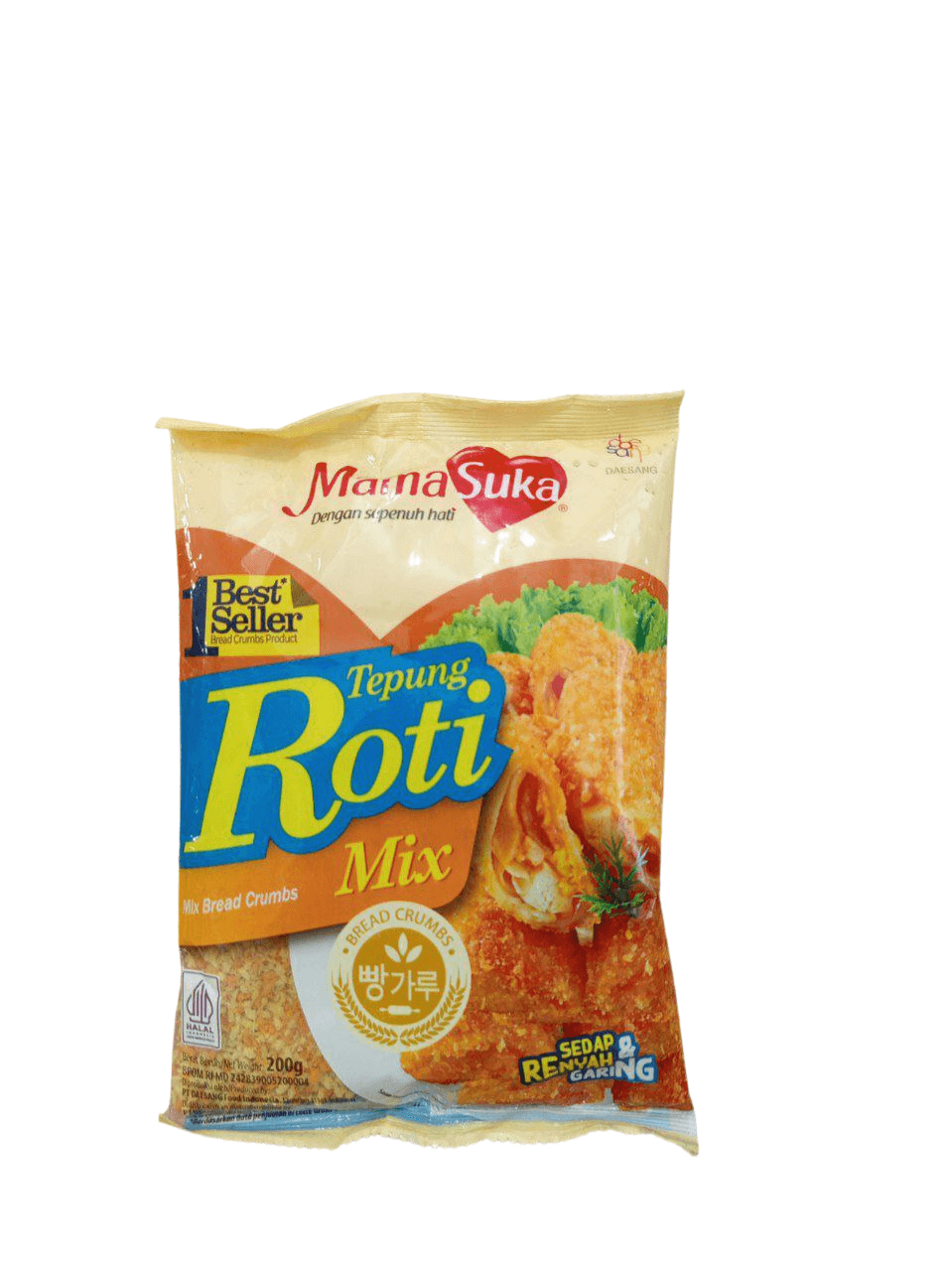 Dengan ukuran praktis 200 gram, sangat pas untuk kebutuhan dapur sehari-hari maupun usaha kuliner. MAMASUKA Tepung Roti Mix menghasilkan lapisan luar yang renyah dan warna keemasan yang cantik, menjadikan masakan lebih menarik dan lezat.