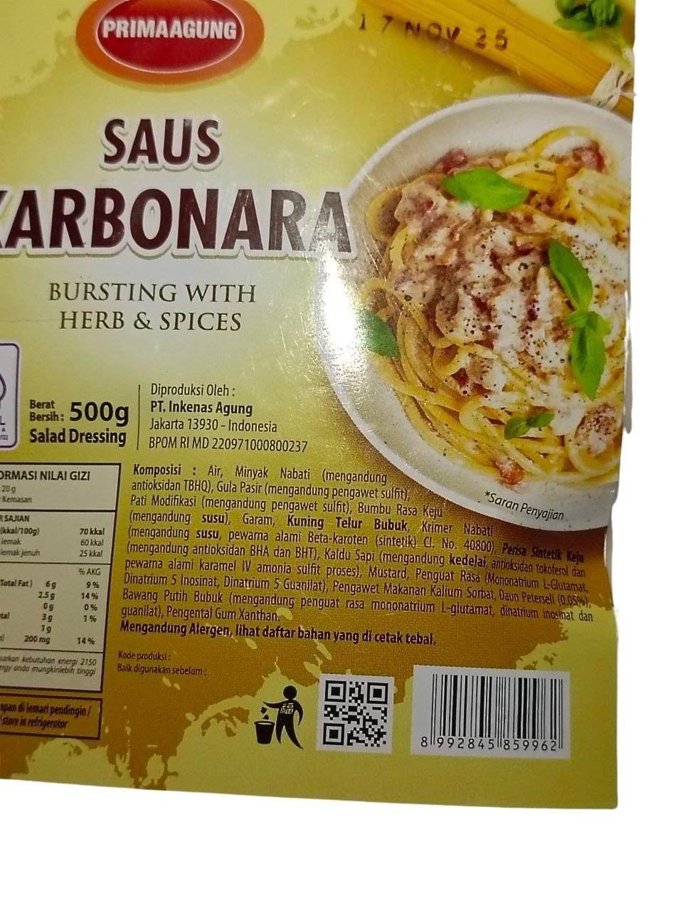 Nikmati kelezatan saus khas Italia dalam setiap hidangan dengan PRIMAAGUNG Saus Karbonara 500gr. Terbuat dari perpaduan sempurna antara krim susu, keju, dan bumbu pilihan, saus ini siap memberikan cita rasa creamy dan gurih yang autentik.