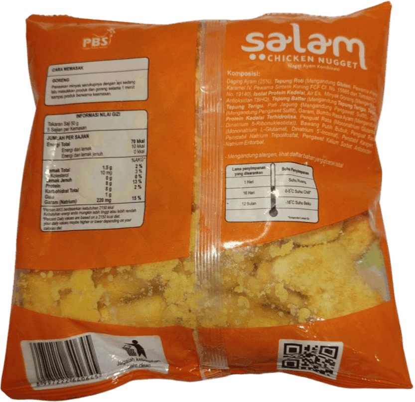 Nikmati kelezatan praktis setiap hari dengan SALAM Nugget Ayam! Dibuat dari daging ayam pilihan yang diolah dengan bumbu khas, nugget ini memiliki tekstur renyah di luar dan lembut di dalam. Cocok untuk bekal anak, camilan keluarga, atau hidangan pelengkap yang menggugah selera.