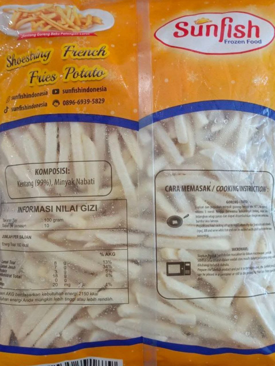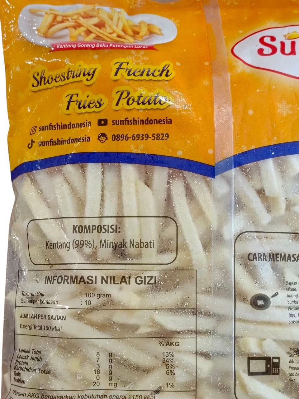 Nikmati sensasi kentang goreng renyah ala restoran di rumah bersama SUNFISH Shoestring 1kg! Potongan tipis memanjang (shoestring) membuat kentang cepat matang, garing di luar dan lembut di dalam. Cocok disajikan sebagai camilan, pendamping hidangan utama, atau menu jualan di usaha kuliner Anda.