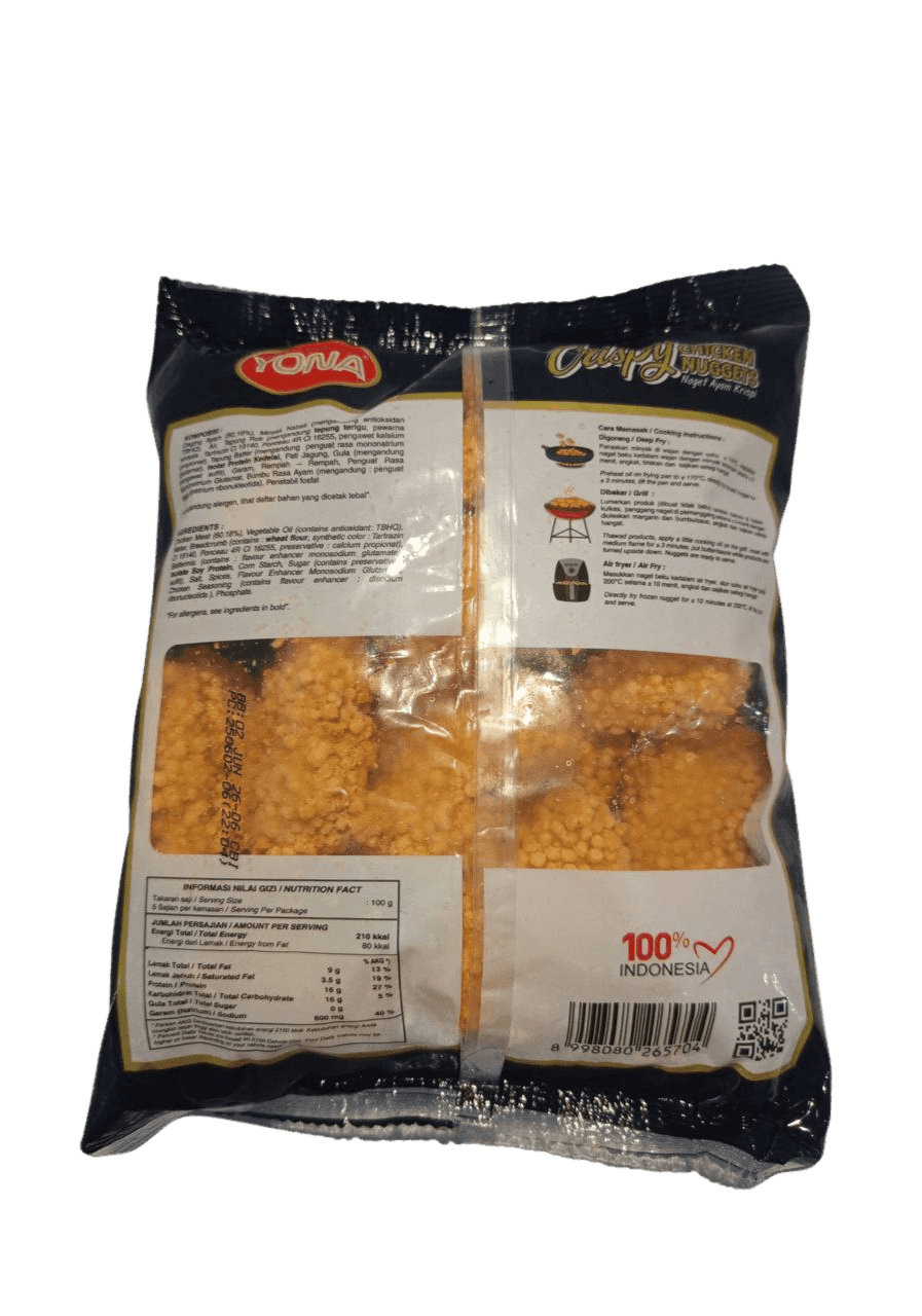 Hadirkan kelezatan nugget ayam crispy dalam setiap gigitan dengan YONA Nugget Ayam Crispy 500gr. Dibuat dari daging ayam berkualitas, dibalut tepung renyah khas, menghasilkan nugget yang gurih di dalam, super crispy di luar. Cocok untuk lauk, camilan, atau menu bekal praktis.
