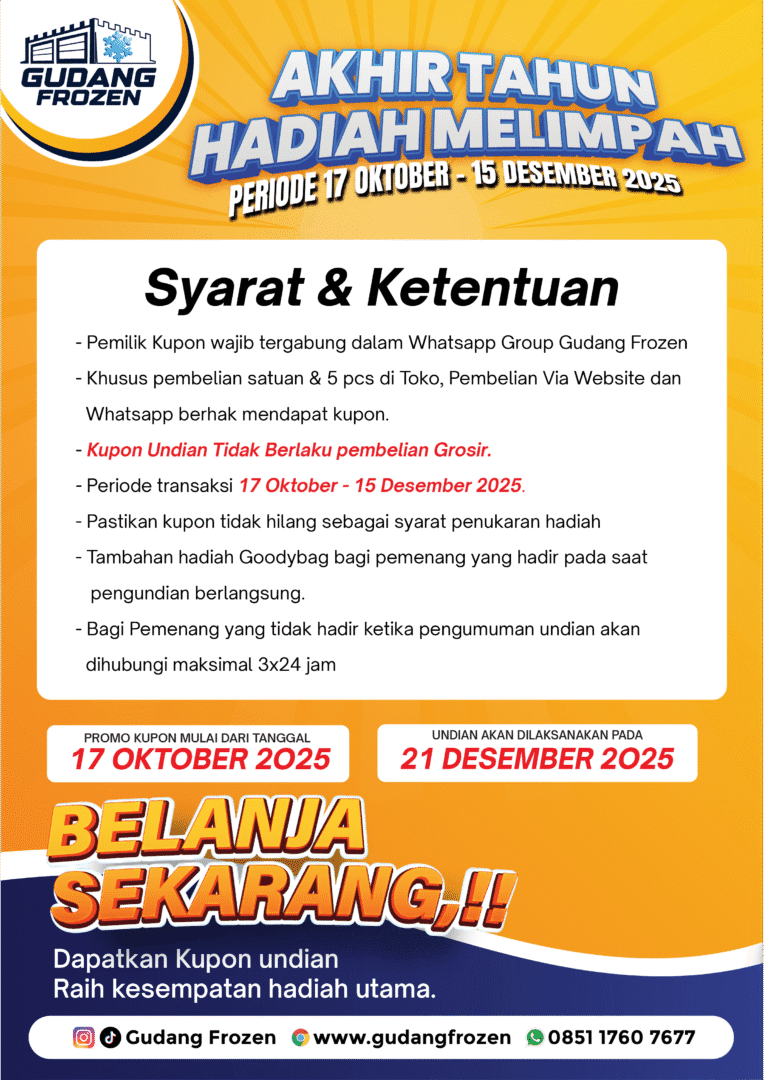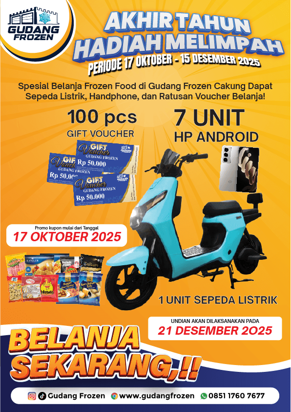 Akhir tahun makin seru dengan Undian Promo Gudang Frozen! Periode 17 Oktober hingga 15 Desember 2025, setiap pembelian frozen food di Gudang Frozen Cakung berkesempatan memenangkan hadiah utama 1 unit sepeda listrik, 7 unit HP Android, dan 100 voucher belanja senilai Rp 50.000! Cukup dengan berbelanja produk frozen food favoritmu, baik langsung di toko, melalui WhatsApp, atau website resmi www.gudangfrozen.com, kamu bisa mendapatkan kupon undian berhadiah akhir tahun ini.